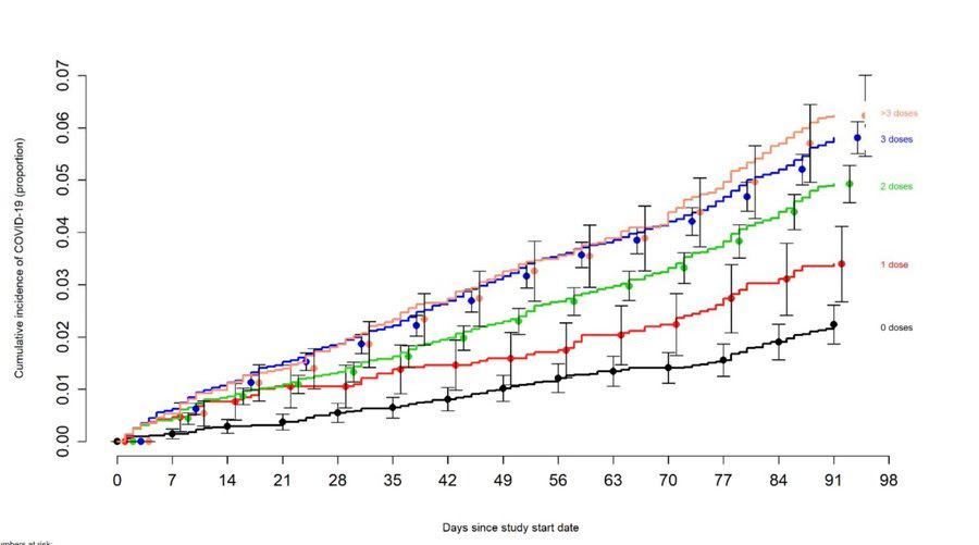 A new Cleveland Clinic pre-print study (as well as this followup study) is the latest to show that the “risk of COVID-19 increased with time since the most recent prior COVID-19 episode and with the number of vaccine doses previously received”—meaning that the more jabs you get the more often and faster you get sick with C19. This effect was even more surprising to researchers in that it was seen not in the elderly but young healthy people with zero comorbidities. What’s more, over a 90-day period, participants with three or more doses faced a risk of catching C19 up to SIX TIMES higher than the baseline. Perhaps most surprising of all, the researchers figured out that unvaccinated and low-vaccinated people were the ones most likely to NOT wear masks, isolate, or otherwise mitigate their risks but, despite being C19 “risk takers,” they were STILL catching C19 less often than their boosted co-workers.